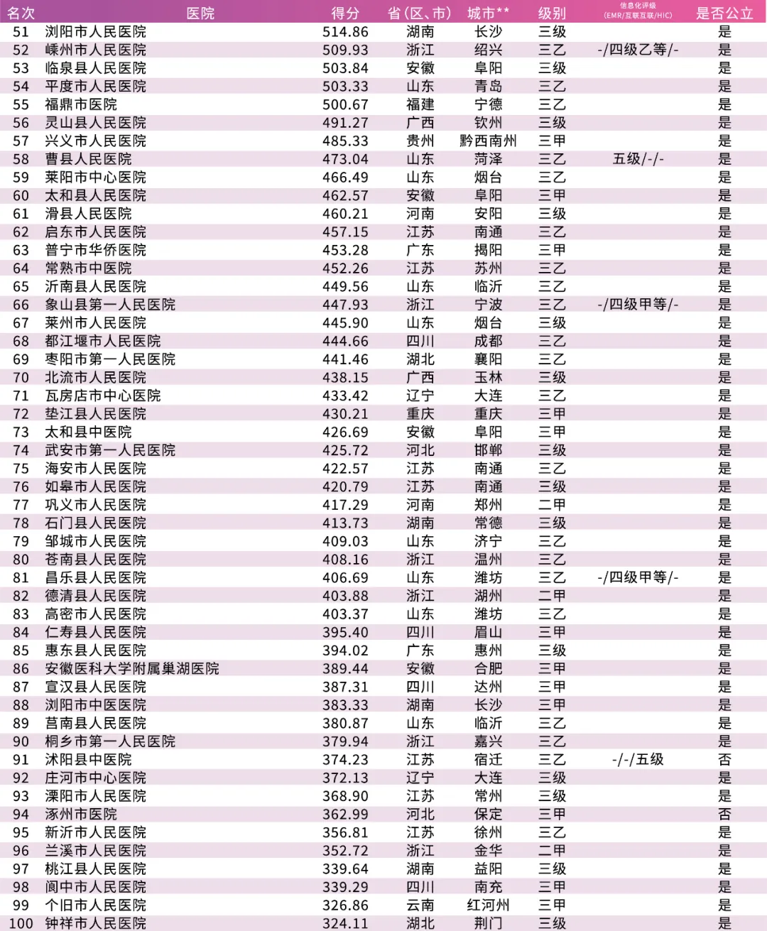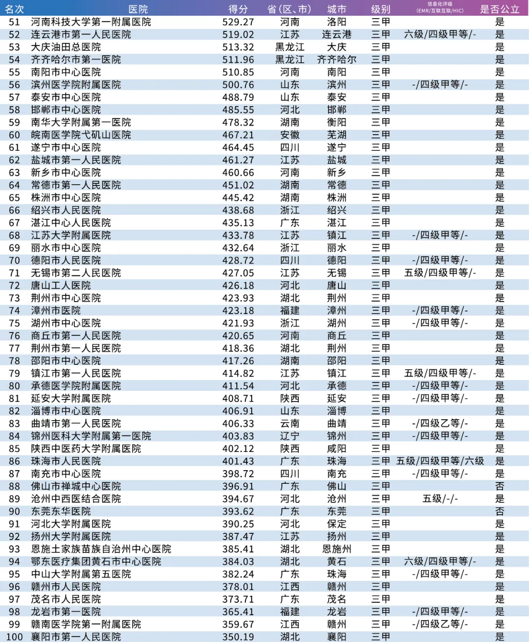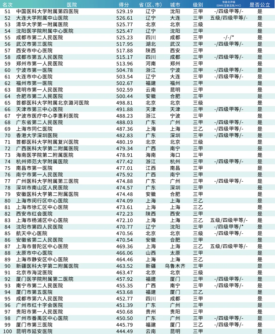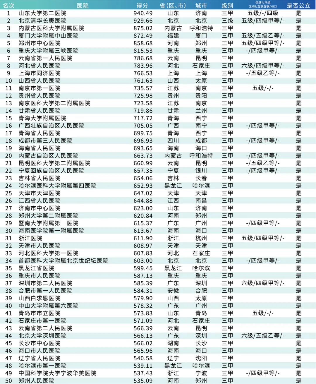 榜單前三強(qiáng)為:山東大學(xué)第二醫(yī)院,北京清華長庚醫(yī)院,內(nèi)蒙古醫(yī)科大學(xué)附屬醫(yī)院。