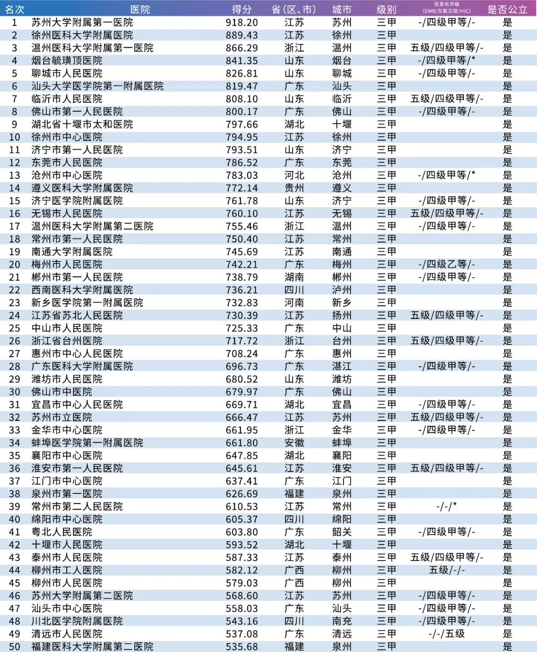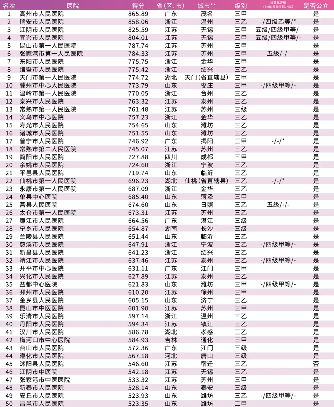 榜單前三強(qiáng)為:廣東省高州市人民醫(yī)院、浙江省瑞安市人民醫(yī)院、江蘇省江陰市人民醫(yī)院。