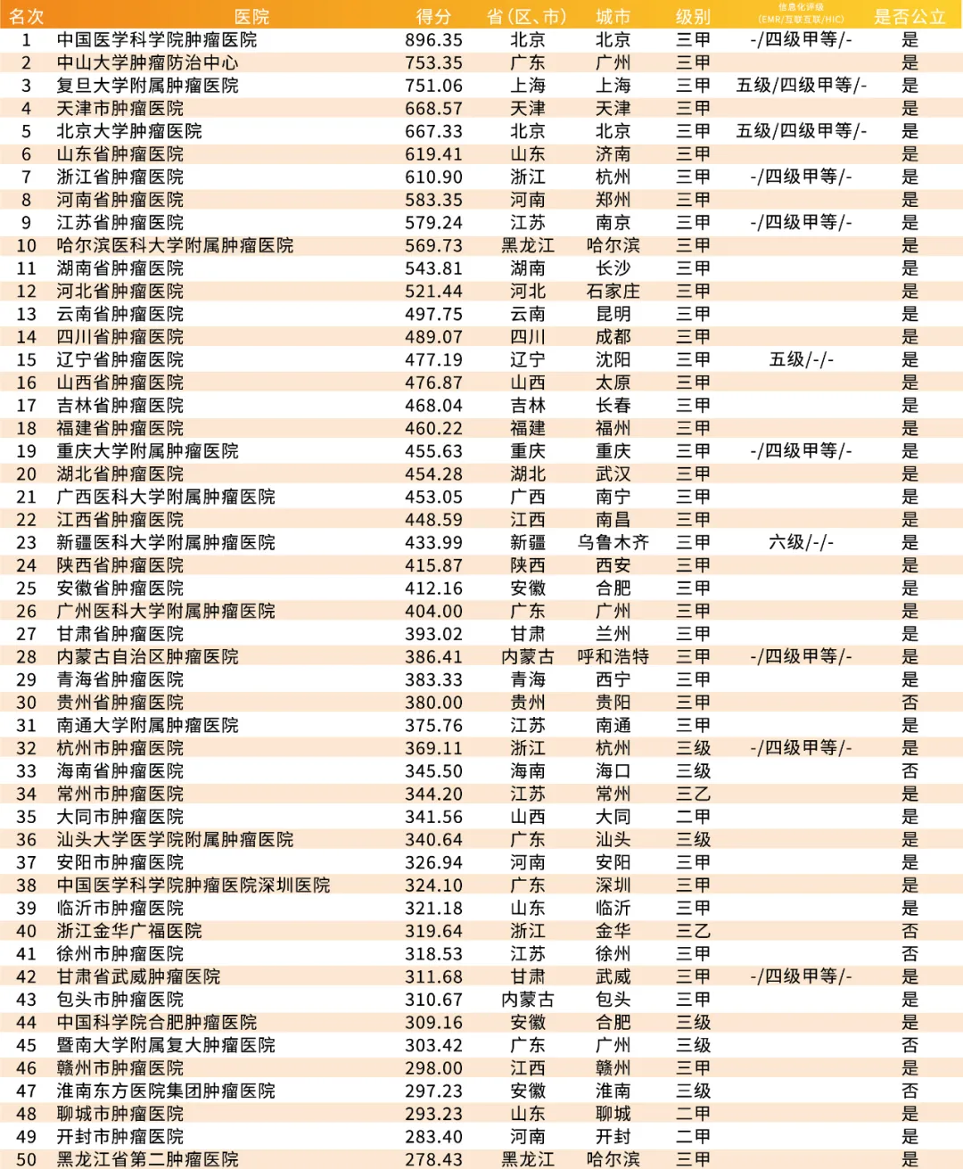 榜單前三強(qiáng)為:中國醫(yī)學(xué)科學(xué)院腫瘤醫(yī)院、中山大學(xué)腫瘤防治中心、復(fù)旦大學(xué)附屬腫瘤醫(yī)院。