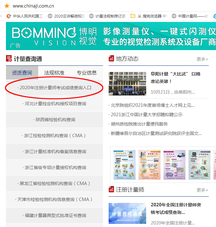 2.中國計(jì)量網(wǎng)(http://www.chinajl.com.cn/)已開通全國注冊計(jì)量師查詢?nèi)肟陧撁妫L問中國計(jì)量網(wǎng),點(diǎn)擊首頁左側(cè)"2020年全國注冊計(jì)量師資格考試成績查詢?nèi)肟?quot;即可進(jìn)入查詢頁面(或點(diǎn)擊本文底部閱讀原文)。