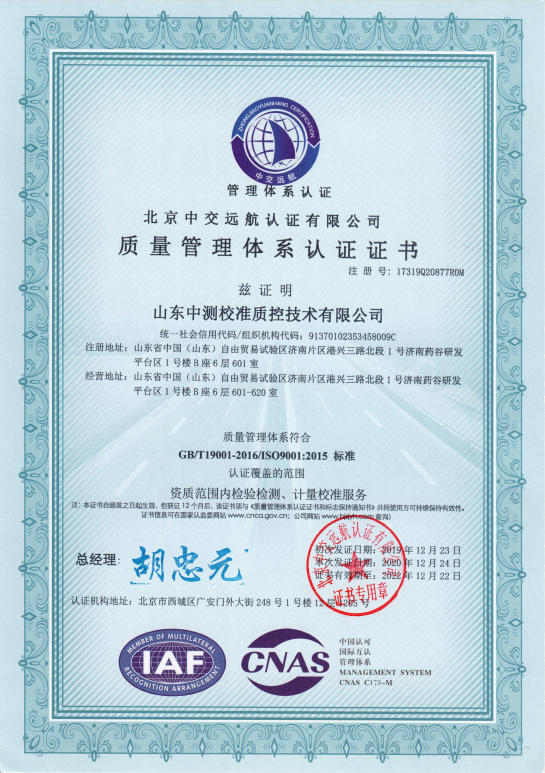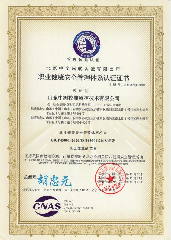 2021年1月4日,山東中測校準(zhǔn)質(zhì)控技術(shù)有限公司通過ISO9001、ISO14001、ISO45001三體系監(jiān)督評審工作。