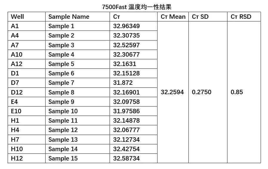 參編作者使用不用廠家、不同型號的PCR儀,對于PCR儀溫度偏差、溫度均勻性、PCR儀器的恒溫時間(Hold-Time)等方面進行了試驗研究和結(jié)果分析。 1 PCR儀溫度準確性影響的研究 參編作者使用不同基因片段,包括:新冠假病毒片段、轉(zhuǎn)基因玉米MON863基因片段,細菌毒力基因片段等開展了溫度偏差影響的研究。研究中使用的設備涉及:7500FAST定量PCR儀(ABI公司、CFX96? Real-Time System(BIO-RAD公司)、Roche 480(羅氏公司)等。研究中使用含以上基因片段的標準品或質(zhì)控品,按照日常檢測的標準方法或技術(shù)規(guī)范給出的PCR擴增程序進行目標片段的擴增。 研究中人為將程序中規(guī)定的溫度調(diào)高或調(diào)低1°C、2°C、3°C、5°C等,模擬反應池溫度與規(guī)定值有偏差的反應條件,探索其對擴增結(jié)果和Cт值影響。試驗結(jié)果顯示,當實驗研究使用的模版濃度較高時,溫度偏差對PCR擴增效果的影響不明顯。但使用中低濃度模板時,溫度偏差對PCR擴增效果有影響。 例如,在低濃度樣品濃度的試驗研究中,使用含轉(zhuǎn)基因玉米MON863基因片段的標準品,即將MON863質(zhì)粒DNA采用10倍梯度稀釋至濃度為0.8 copies/μL,此時測定的標準曲線R2為0.999,擴增效率為104%,說明該標準曲線具有良好的線性關系,因此,選取該濃度水平作為低濃度測試水平。以此為弱陽性樣品,按照《SN/T 1196-2018 轉(zhuǎn)基因成分檢測玉米檢測方法》的規(guī)定的擴增程序進行實時熒光PCR檢測,對不同溫度偏差下的CT進行匯總和統(tǒng)計分析后,結(jié)果顯示:對于AB 7500儀器而言,當反應程序整體溫度調(diào)高1℃、整體溫度降低1℃、時,AB 7500儀器檢測弱陽性樣本CT值存在差異,說明當AB 7500儀器溫度變化時,弱陽性樣本檢測CT值受到影響。標準程序溫度整體調(diào)高1℃至調(diào)低1℃,弱陽性樣本均檢出,檢出率和結(jié)果判定未受到影響,但是弱陽性樣本檢測CT值受到影響,說明弱陽性樣本的拷貝數(shù)在一定范圍內(nèi)時,AB7500儀器的溫度整體變化后檢出率不受影響,但是當弱陽性樣本的拷貝數(shù)降低到某個的臨界值時,AB7500儀器的溫度整體變化后,弱陽性樣本的檢出率將會受到影響。 使用CFX96? Real-Time System進行的實驗結(jié)果,與上述結(jié)論類似。采用其他片段(新冠病毒基因片段、細菌StxI基因片段)和儀器(Roche 480)試驗后,對于中低濃度模板的實驗結(jié)果也呈現(xiàn)上述趨勢。但對于雙鏈DNA的擴增,在引物和酶充足的情況下,對溫度的需求比較寬泛,尤其是當擴增中涉及的溫度點比較少,控溫時間短的反應條件,對溫度的影響不敏感。 2 溫度均一性對檢測結(jié)果影響的研究 為了了解反應池不同孔位置差異對擴增效果的影響,即反應池不同部位擴增效果的差異,參編作者進行了溫度均一性影響的測試。使用轉(zhuǎn)基因玉米MON863基因片段,選取低濃度(0.8copies/μL)的質(zhì)粒DNA溶液作為檢測樣品,即低濃度模板樣品,樣品放于儀器上可能出現(xiàn)溫度差異的位置,擺放位置為1A、1D、1H、4A、4E、4H、7A、7D、7H、10A、10E、10H、12A、12D、12H,詳細見圖1,7500FAST定量PCR儀及CFX96? Real-Time System兩個品牌儀器同時進行了測試。 樣品擺放位置圖 下表是使用7500 Fast進行溫度均一性測試的結(jié)果,整體來看,A1的CT值與其他位置相比較為最高,H12次之。說明板位的A1、H12與其他位置相比可能存在溫度差異。 橫向?qū)Ρ葋砜矗篈1、A4、A7、A10、A12中A1的CT值最大,A7次之,其他位置相近;D1、D7、D12中,D7的CT值最小,D1、D12相近;E4、E10的CT值相近,且與D7的CT值也相近;H1、H4、H7、H10、H12中H12的CT值最大,H1次之,其他位置相近。結(jié)果說明位于板位中間位置溫度相較于邊緣位置可能更均勻。 縱向?qū)Ρ葋砜矗篈1、D1、H1中A1的CT值最大,D1、H1相近;A4、E4、H4中A4的CT值最大,E4、H4相近;A7、D7、H7中A7的CT值最大,D7、H7相近;A10、E10、H10中A10的CT值最大,E10、H10相近;A12、D12、H12中H12的CT值最大,A12、D12相近。說明縱向來看三個樣品中中間的樣品CT值有更低的趨勢,板位的上方位置(A)樣品的CT值相較于其他兩個位置(D、H)更高,板位上方位置(A)溫度與其他位置可能存在差異。 試驗研究表明,在溫度均勻性方面,7500 Fast與CFX96的兩種設備的試驗結(jié)論類似。7500 Fast板位中間溫度具有更均勻的趨勢,CFX96板位右下方溫度可能與其他位置存在差異,當然不排除具體機器的差異。對兩種設備的空間均勻性測試均表明,反應池不同孔位置存在擴增效果的差異。在試驗中應盡量將檢測樣品置于板位中間位置,減少儀器所造成的系統(tǒng)誤差。 3 PCR儀恒溫時間(Hold-Time)偏差的影響研究 使用羊全基因組DNA,采用QIAGEN DNeasy Blood & Tissue Kit 試劑盒,提取羊肌肉組織DNA。為了驗證恒溫時間(Hold-Time)對擴增結(jié)果的影響,我們分別對每臺PCR儀“變性-退火-延伸”三個步驟的恒溫時間(Hold-Time)統(tǒng)一調(diào)整,分別調(diào)整為30s,28s,25s,20s,15s。將上一步5個批次獲得的擴增結(jié)果進行測序分析,測序由ABI3730儀器完成。將得到的測序結(jié)果與模板序列進行BLAST比對,分析擴增產(chǎn)物的序列準確性(是否有基因錯配)。 從上表中可以看出,BIOER LifeECO型號PCR儀在“變性-退火-延伸”三個步驟的恒溫時間(Hold-Time)統(tǒng)一調(diào)節(jié)至25s時已經(jīng)出現(xiàn)明顯擴增結(jié)果異常,繼續(xù)下調(diào)至20s、15s時出現(xiàn)擴增實驗失敗。也就是說,當設定溫度上的恒溫