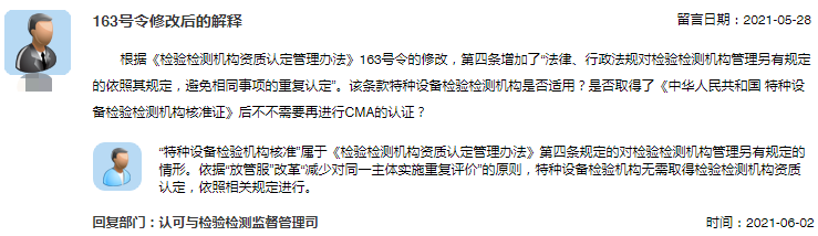 根據(jù)《檢驗(yàn)檢測機(jī)構(gòu)資質(zhì)認(rèn)定管理辦法》163號令的修改,第四條增加了“法律、行政法規(guī)對檢驗(yàn)檢測機(jī)構(gòu)管理另有規(guī)定的依照其規(guī)定,避免相同事項(xiàng)的重復(fù)認(rèn)定”。該條款特種設(shè)備檢驗(yàn)檢測機(jī)構(gòu)是否適用?是否取得了《中華人民共和國 特種設(shè)備檢驗(yàn)檢測機(jī)構(gòu)核準(zhǔn)證》后不不需要再進(jìn)行CMA的認(rèn)證?“特種設(shè)備檢驗(yàn)機(jī)構(gòu)核準(zhǔn)”屬于《檢驗(yàn)檢測機(jī)構(gòu)資質(zhì)認(rèn)定管理辦法》第四條規(guī)定的對檢驗(yàn)檢測機(jī)構(gòu)管理另有規(guī)定的情形。依據(jù)“放管服”改革“減少對同一主體實(shí)施重復(fù)評價(jià)”的原則,特種設(shè)備檢驗(yàn)機(jī)構(gòu)無需取得檢驗(yàn)檢測機(jī)構(gòu)資質(zhì)認(rèn)定,依照相關(guān)規(guī)定進(jìn)行。回復(fù)部門:認(rèn)可與檢驗(yàn)檢測監(jiān)督管理司